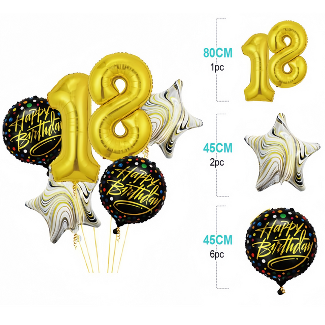 Festeggia il 18° compleanno in grande stile con questo set di palloncini dorati e neri, perfetti per creare un’atmosfera elegante e festosa!